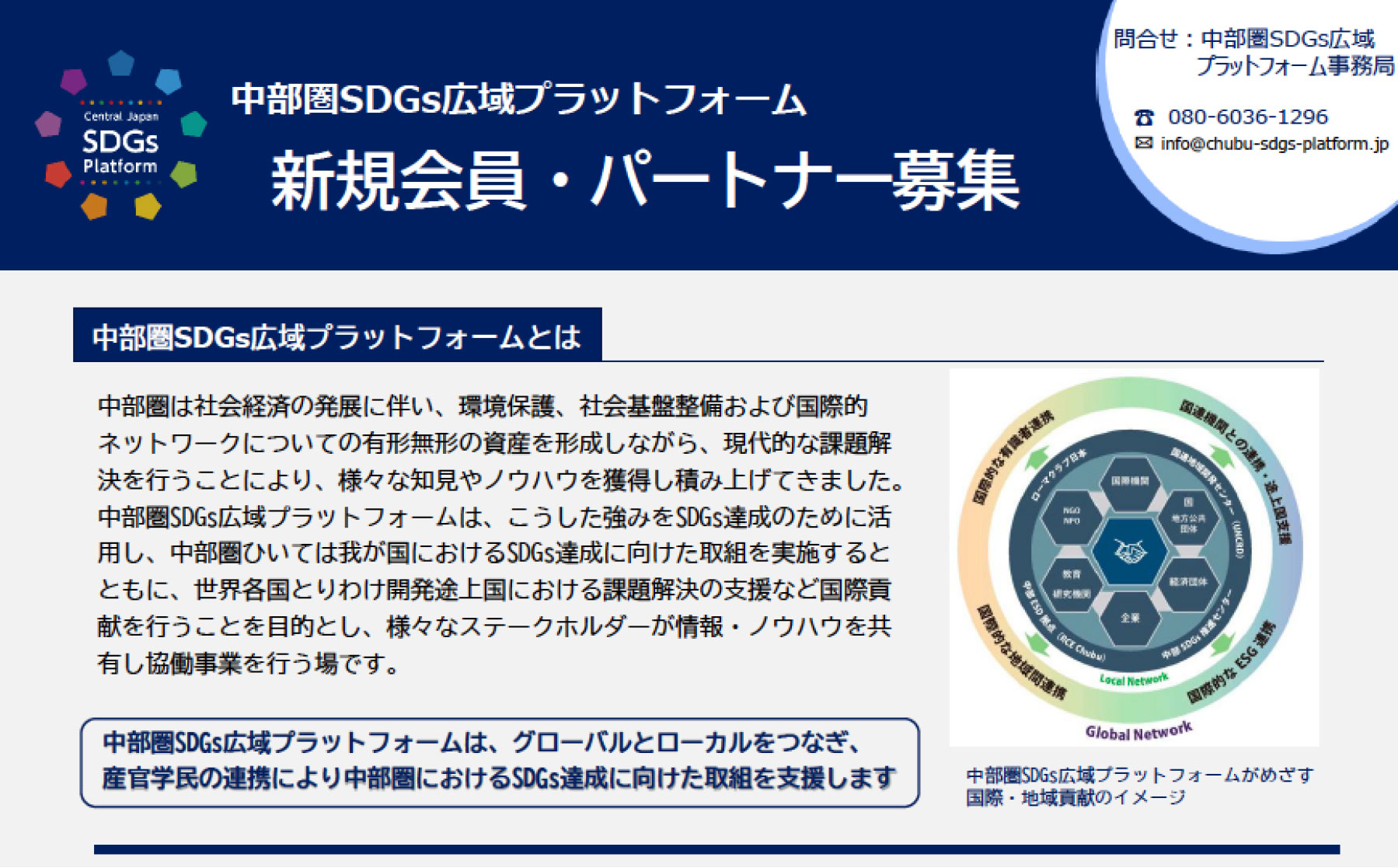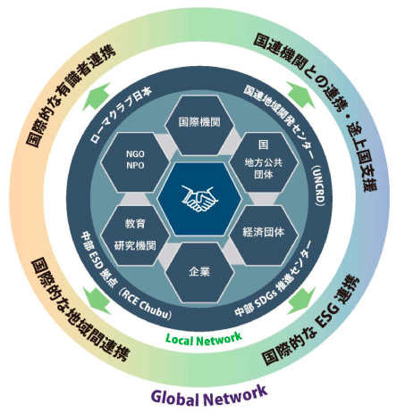 地域・国際連携中部圏SDGs広域プラットフォームは、グローバルとローカルをつなぎ、産官学民の連携により中部圏におけるSDGs達成に向けた取組を支援します。